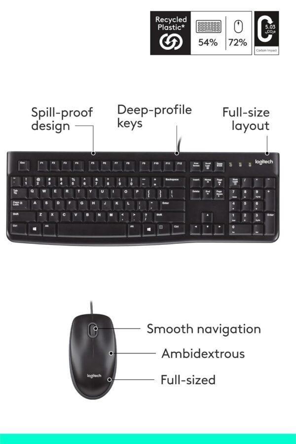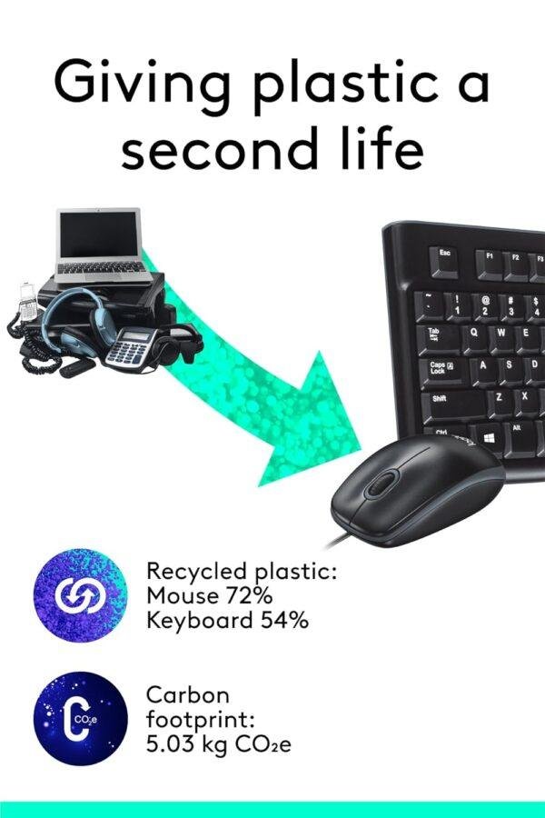 - Plastic parts in MK120 include certified post-consumer recycled plastic: 72% for the mouse and 54% for the keyboard*.
